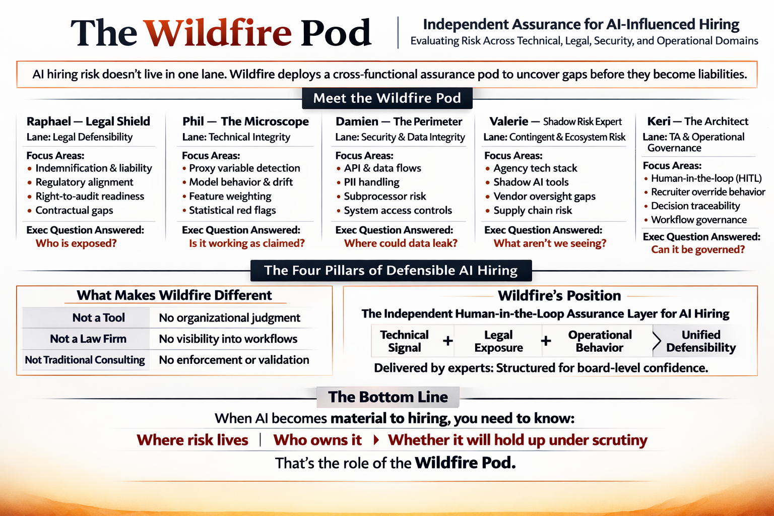 Wildfire Group is a risk advisory firm that audits how talent systems actually behave, then designs governance so automated decisions hold up under legal, regulatory, and reputational scrutiny.
